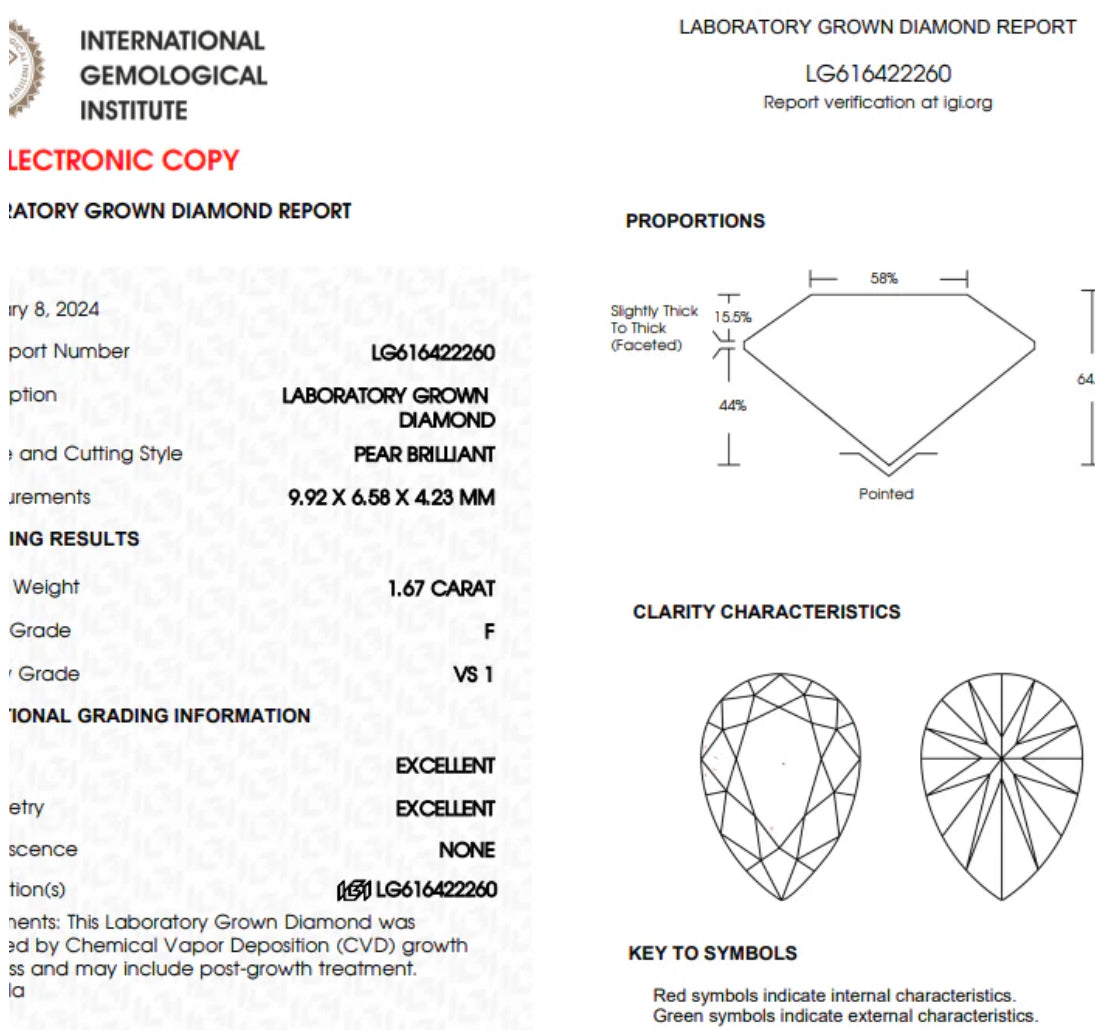 • Center Diamond: ~1.67ct Pear Cut