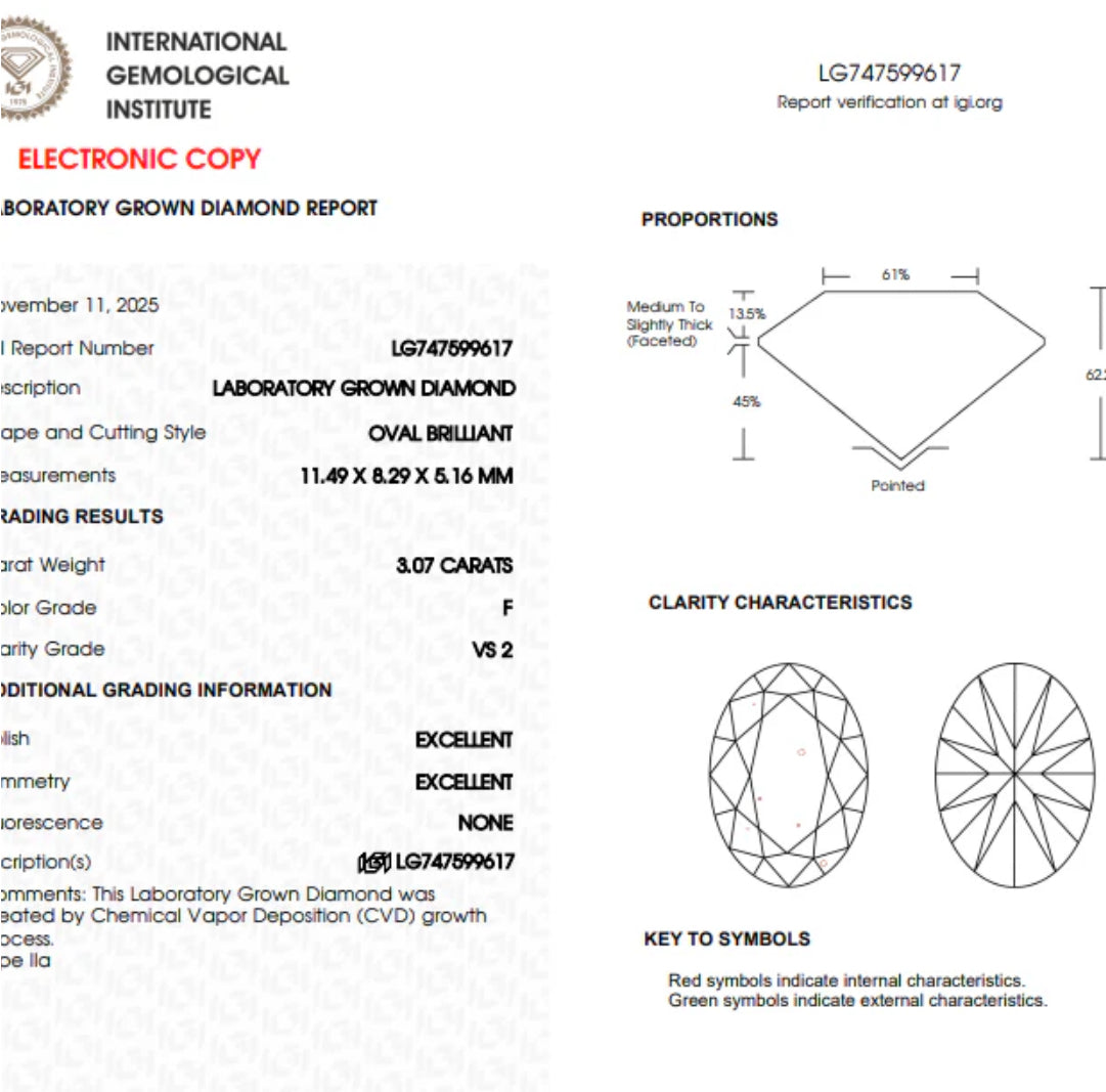 Featuring a stunning 3.07ct lab-grown diamond as the centerpiece, graded F color and VS2 clarity for exceptional whiteness and purity, the diamond is set in certified 14K solid gold with a flawless polish and graceful mounting designed to maximize light reflection and sparkle in every environment.